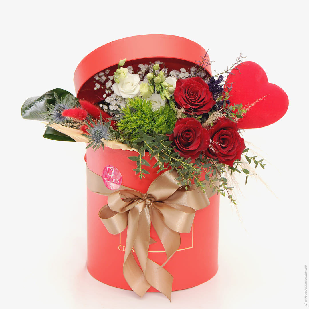 Hat Box of red and white roses.