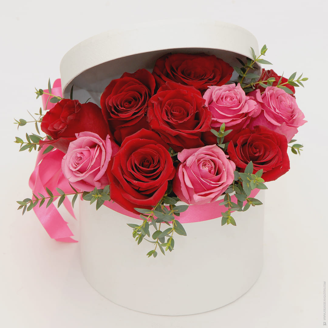 Hat box with red and pink roses. Ideal for Valentine’s Day.