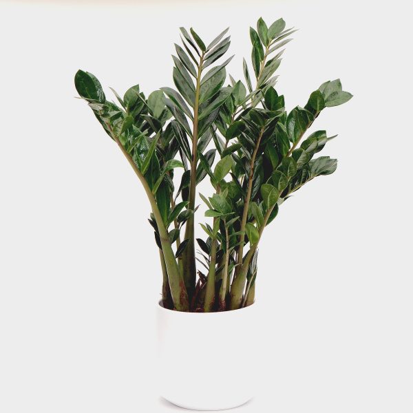 Zamioculca is an ornamental tree, often used for interior decoration on a ceramic base.
