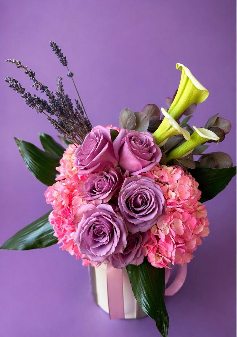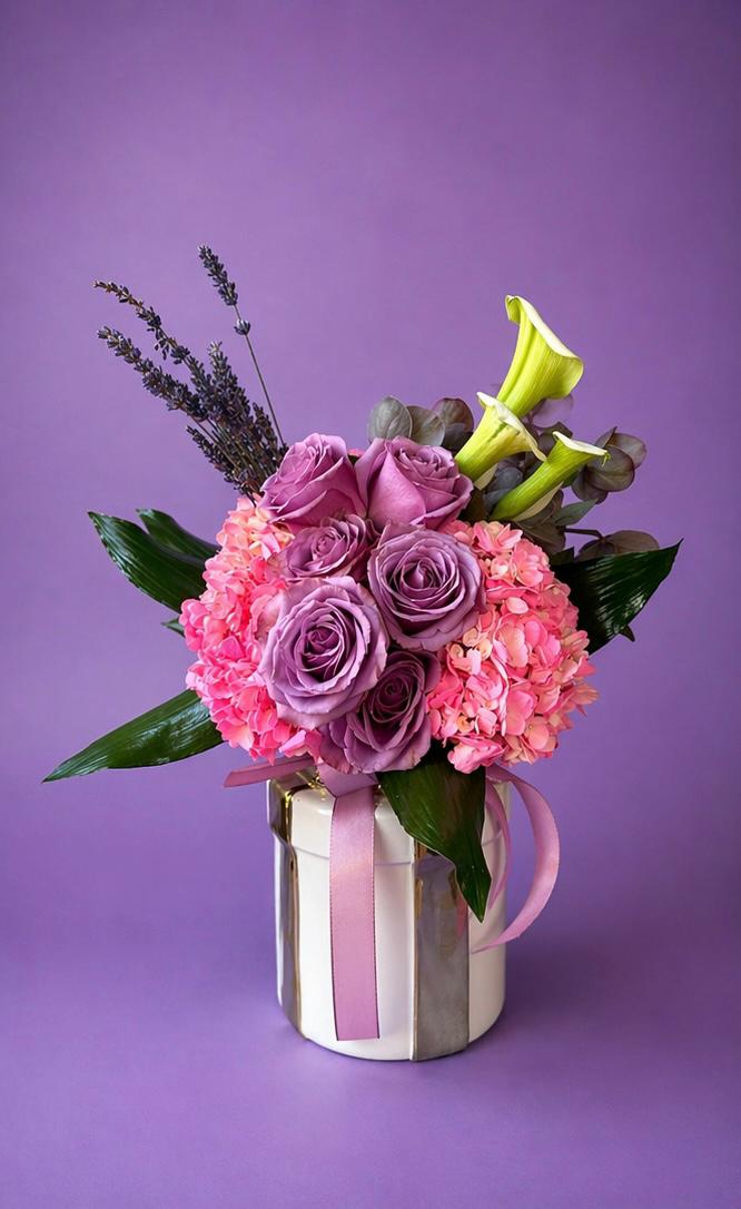 Jarra com composição de flores em tons de rosa e lilas. Ideal para oferecer no Dia da Mãe. Imagem meramente ilustrativa.