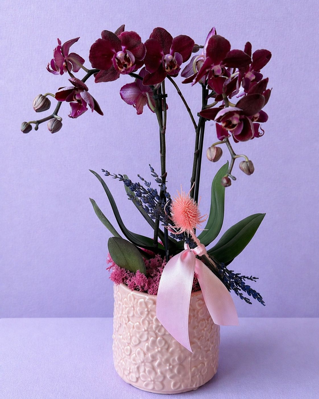 Orquídea decorativa em tons de roxo. Base incluída. Mediante disponibilidade.