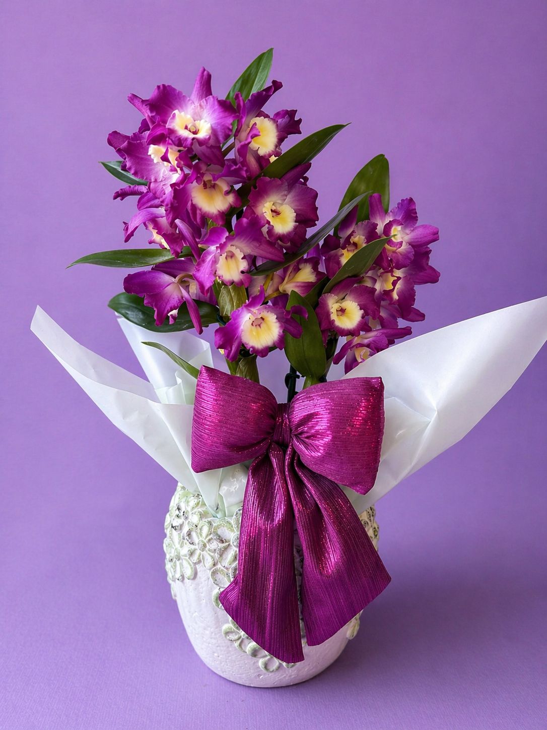 Flor Dendrobium em tons de roxo, ideal para a decoração da casa. Base incluída.