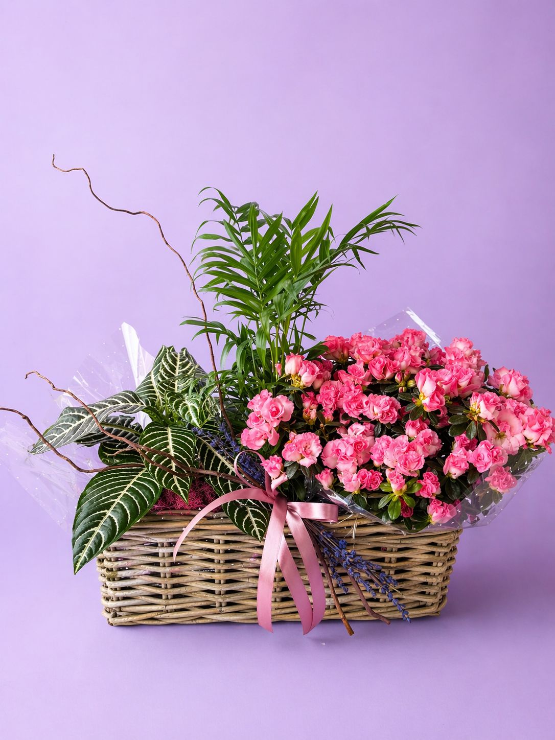 Conjunto composto por azálea, chamaedora e aphelandra. Base incluída.